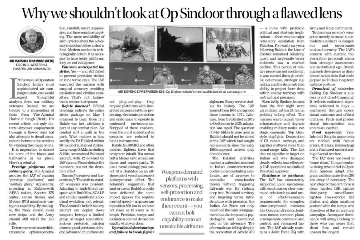 ایئرمارشل نمبیار نے اپنے کالم میں لکھا کہ "ہرمندر سنگھ نے ایئر پاور کے استعمال پر غیر فنی اور تعصب زدہ تبصرہ کیا، جس سے نہ صرف حقائق مسخ ہوئے بلکہ تینوں فورسز کے درمیان دوستی اور اعتماد کے رشتے کو نقصان پہنچا۔”